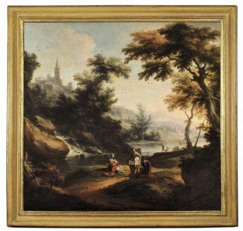 Dipinto olio su tela di cm. 118,5 x 124,5 raffigurante "Paesaggio con figure in riva al fiume" di Cignaroli Vittorio Amedeo (Torino, 1730-1800).